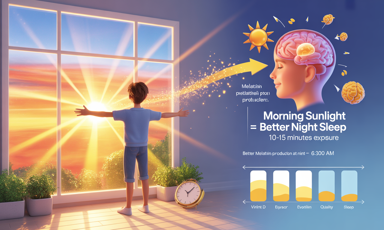 아침에 자연광을 충분히 받으면 멜라토닌 분비가 활성화되어 밤에 더 쉽게 잠들 수 있습니다. 기상 후 30분 이내에 10-15분 정도 햇볕을 쬐는 것을 추천합니다. 이는 수면 장애 예방뿐만 아니라 스트레스 완화에도 효과적입니다.