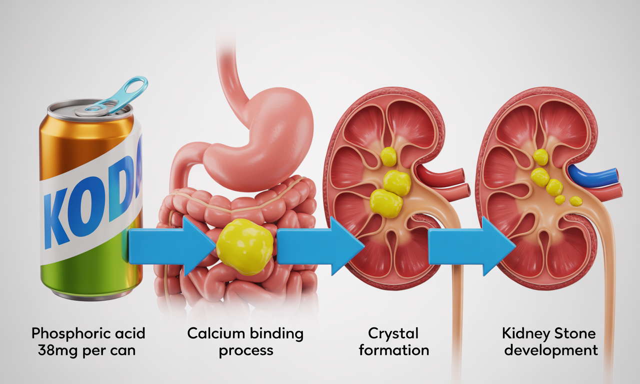 콜라를 비롯한 탄산음료에는 인산(인)이 대량 첨가되어 있습니다. 이 인산은 우리 몸속에서 칼슘과 결합하여 뼈에서 칼슘을 빼내고, 이것이 신장으로 이동하면서 신장 결석을 만들어냅니다.
